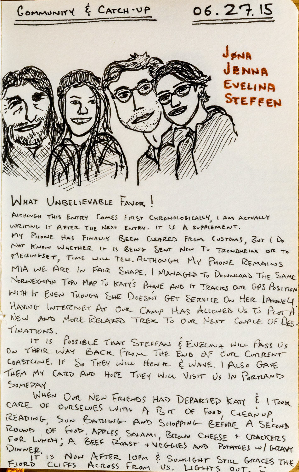 Although this entry comes first chronologically, I am actually writing it after the next entry. It is a supplement. my phone has finally been cleared from customs, but I do not know whether it is being sent now to Trondheim or to Meisingset. Time will tell. Although my pone remains MIA, we are in fair shape. I managed to download the same Norwegian topo map to Katy’s phone and it tracks our GPS position with it, even though she doesn’t get service on her iPhone 4. Having internet at our camp has allowed us to plot a new and more relaxed trek to our next couple of destinations.