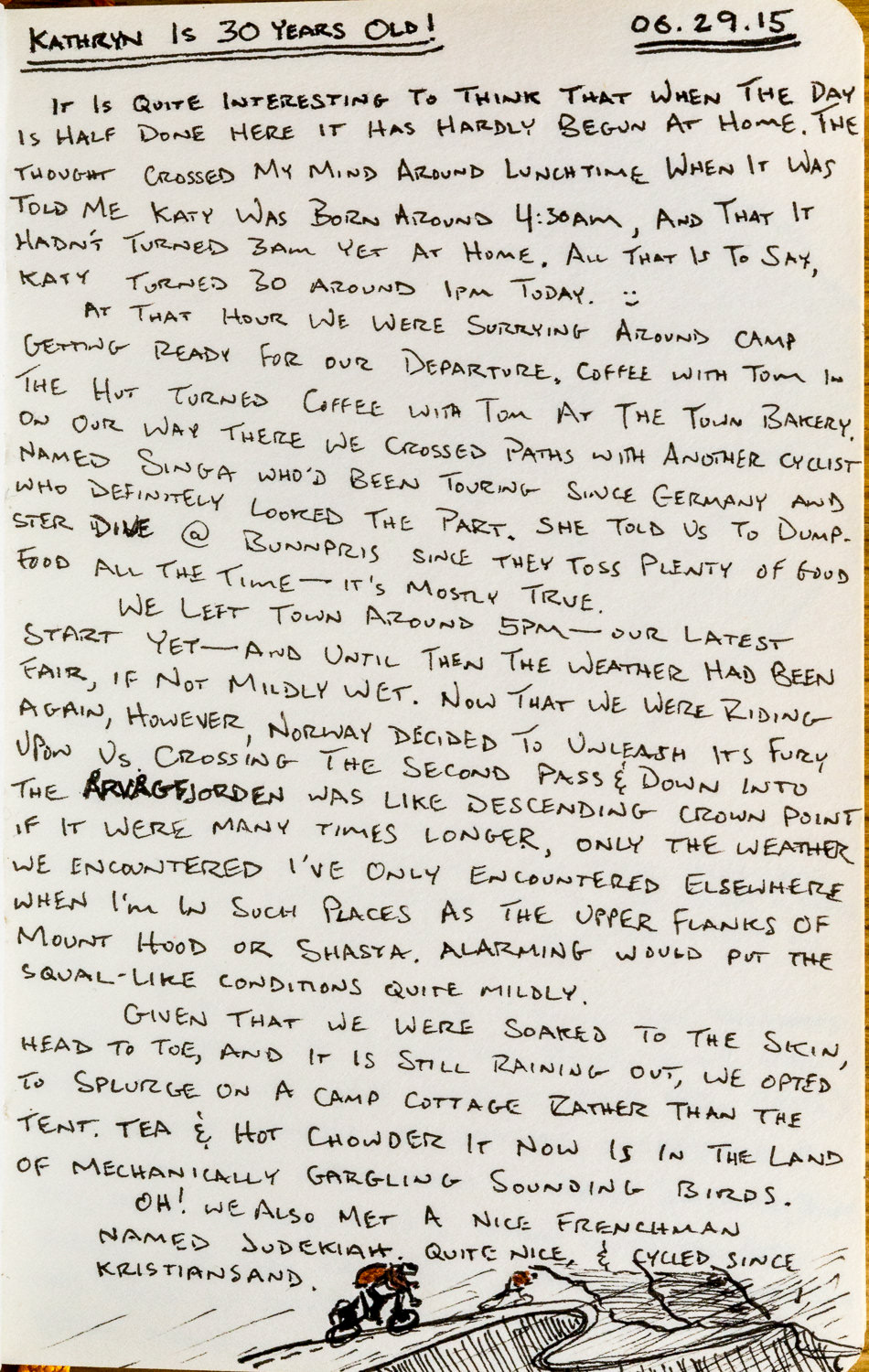 Given that we were soaked to the skin head to toe, and it was still raining out, we opted to splurge on a camp cottage rather than the tent. Tea and hot chowder it now is, in the land of mechanically gargling sounding birds. Oh! We also met a nice frenchman named Judekiah. He was quite nice, and had been cycling since Kristiansand.”